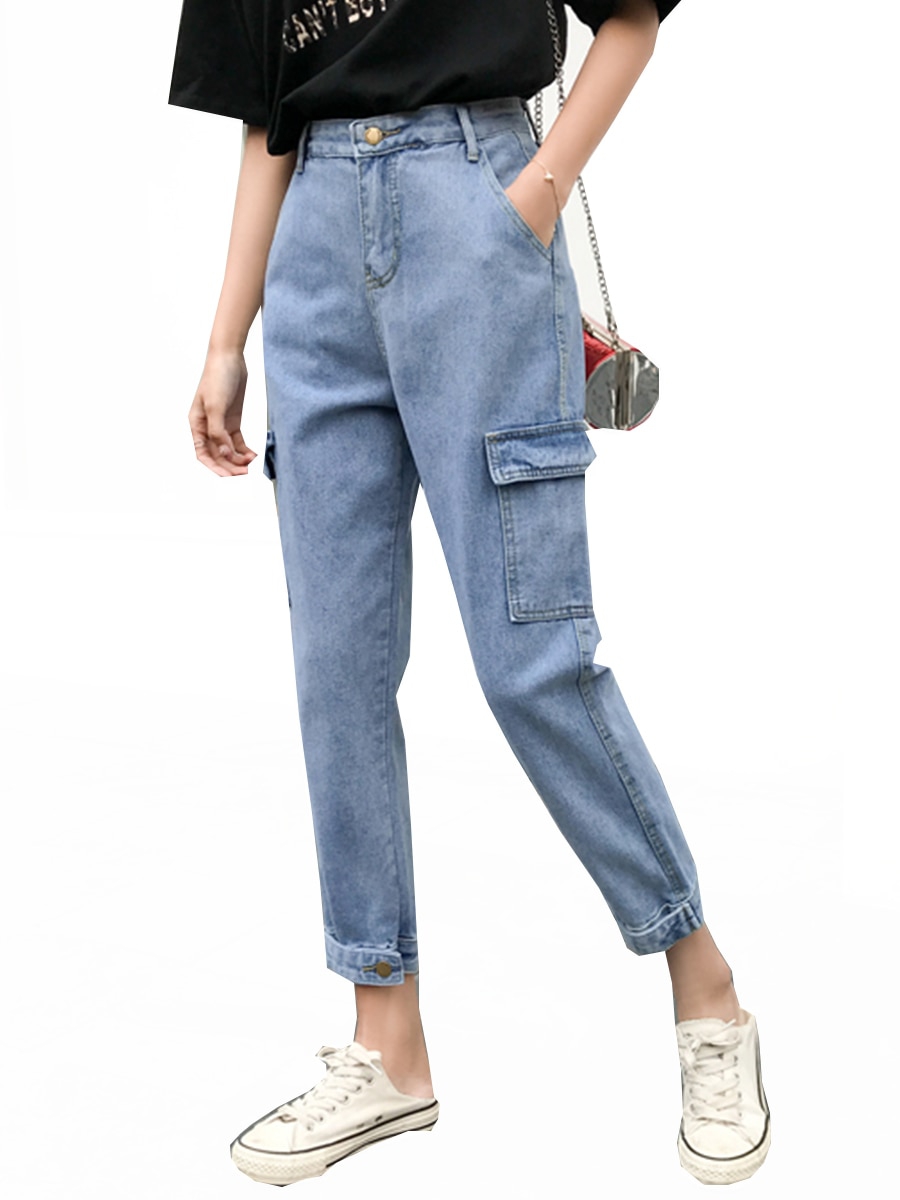 Occasion: Casual, Going Out Elasticity: NonelasticLength: Ninth Fitness: Loose Waistline: High Waist Pattern: Solid ColorDecoration: Button, Pocket, PatchworkMaterial: Polyester